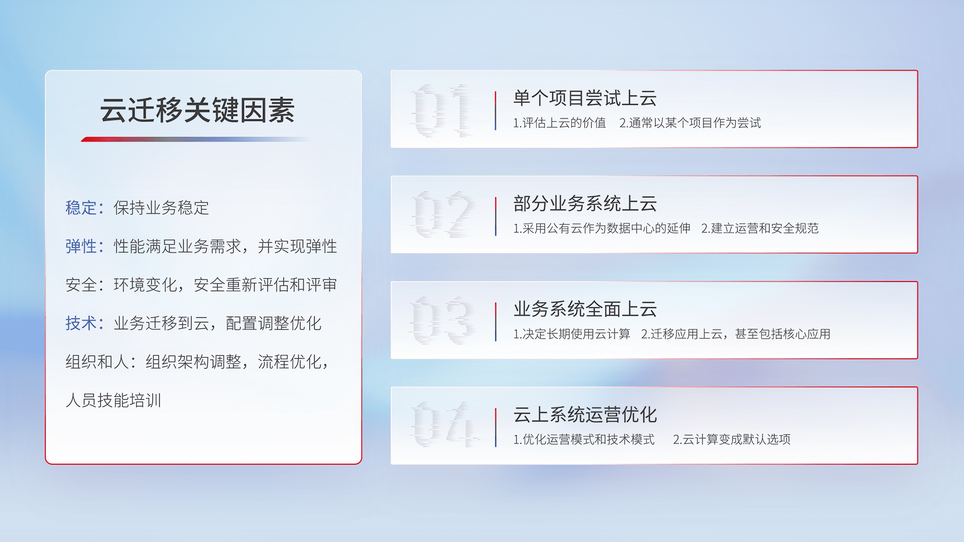 结合实际业务,,,,从规划设计、、云平台选型、、、、云原生改造、、、数据迁移、、集成交付,,迁移全过程为客户识别最佳上云路径,,做好风险识别管理,,设计网络架构、、、身份权限、、、安全审计合规、、、操作审计、、、、日志审计、、、、监控告警策略、、、多站点容灾设计等,,,,对云上基础设施进行整体规划,,提升IT治理水平,,,,以满足弹性、、、、高可用、、高性能的需求。。
