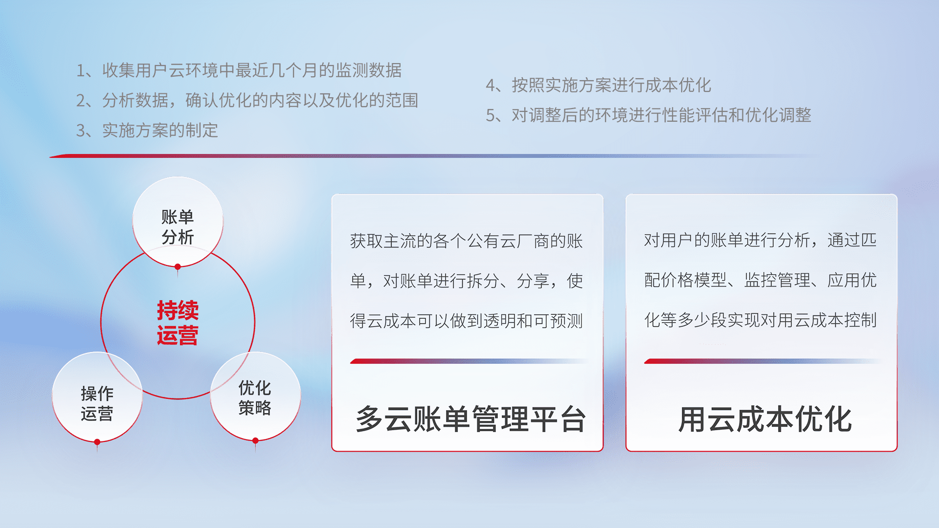通过多云纳管,,,以统一的资源数据模型把客户的云资源进行抽象和封装,,,,进而实现对多云资源的统一操作,,,,保障云资源管理的可靠性、、、、稳定性与可用性。。量身定制化运维内容,,,配置、、开发运维、、补丁管理、、、备份、、、、监控、、认证和访问管理、、、、审计和日常巡检等,,,,保障在用云过程中的可靠度,,稳定度以及高可用率。。。。