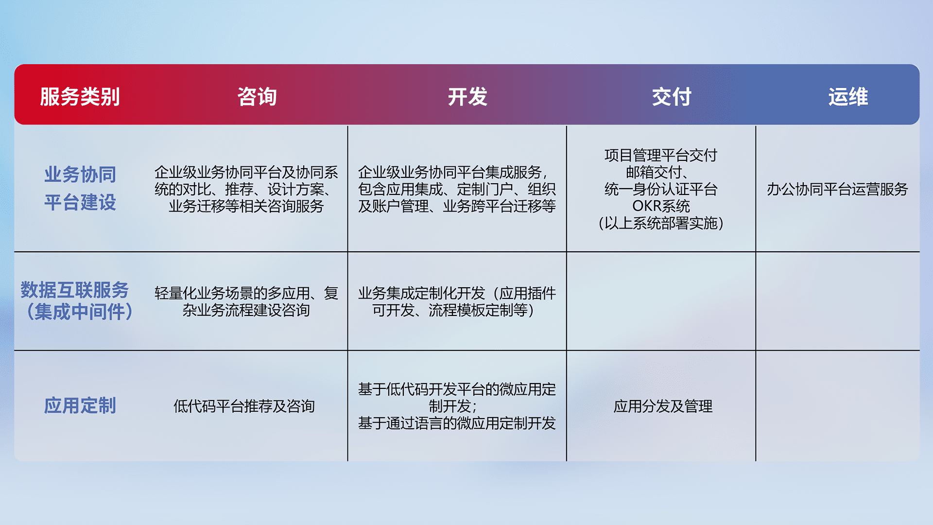 针对钉钉、、企微、、、IDaas等平台级产品提供产品的规划、、、、方案、、、、交付、、、定制化开发等服务,,,实现如统一协同办公、、智能客户服务、、混合会议管理、、、、智能数据查询、、、等业务场景,,,,实现数字化转型。。